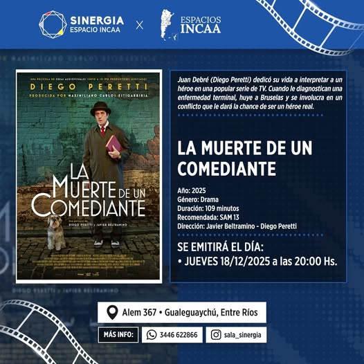 El Espacio INCAA Gualeguaychú despedirá el año con la proyección de la película argentina “La muerte de un comediante”, que se exhibirá este jueves 18 de diciembre, a las 20 horas, en la sala ubicada en Alem 637.